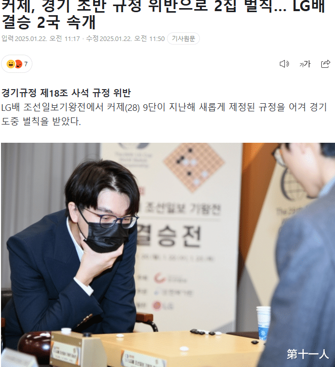 而“朝鲜日报”则表示,“上午10点28分,柯洁因违规被罚两分,34分钟后,比赛于11分02秒重新开始。”文章称,去年的三星杯上,已经开始遵循这个规则,韩国方面就将韩国规则告诉了柯洁。